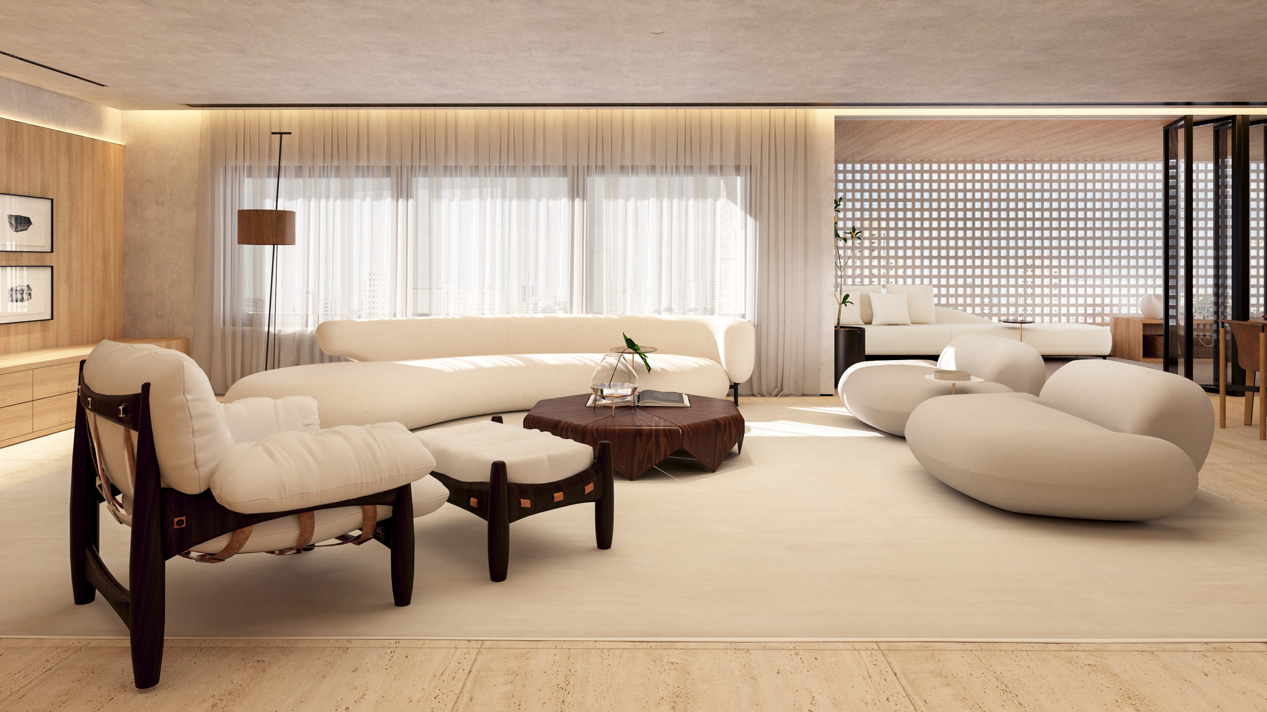 Projeto atemporal e de muito bom gosto, para um jovem casal recém casados. Madeira clara com mobiliários assinados, vão de encontro com ao design atemporal proposto ao projeto. Linhas curvas, base neutra e texturas fazem parte da composição proposta pelo nosso escritório.